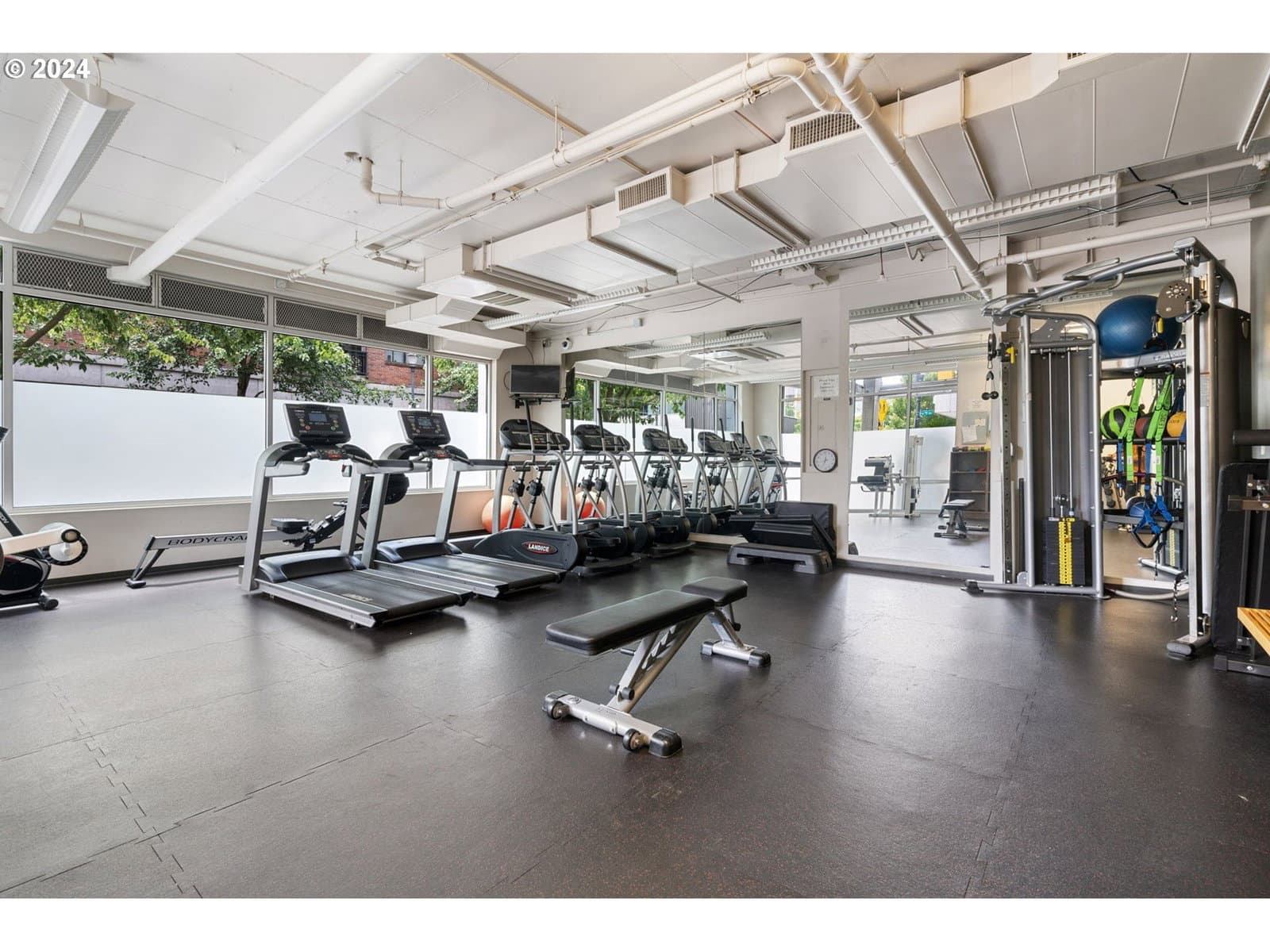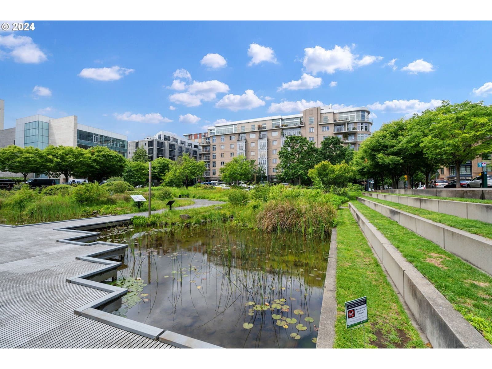 Light-filled condo at the Lexis overlooking Tanner Springs Park in Portland's Pearl District. Lights streams into this NW corner unit featuring floor-to-ceiling windows with designer touches and thoughtful updates. Kitchen has quartz counters, stainless steel appliances and a four-seat breakfast bar seamlessly connecting to the spacious living room. Primary bedroom with walk-in closet, ensuite bath & private balcony. In unit washer and dryer. Dedicated parking in a secure garage plus storage unit. Energy-efficient mini-split provides heating and cooling. Community includes a gym, meeting room and party room / lounge. Excellent location next to the streetcar. Strong HOA, rentals allowed with a cap. Walk Score 98, Bike Score 99.