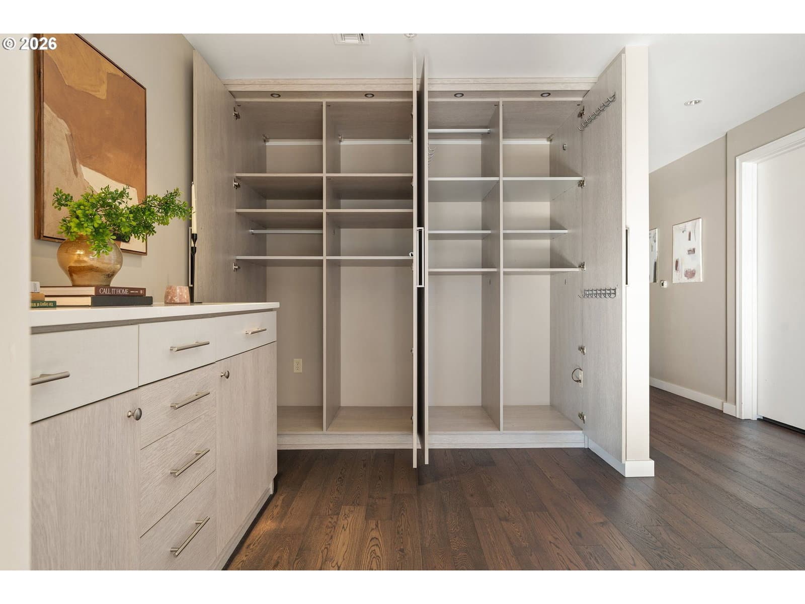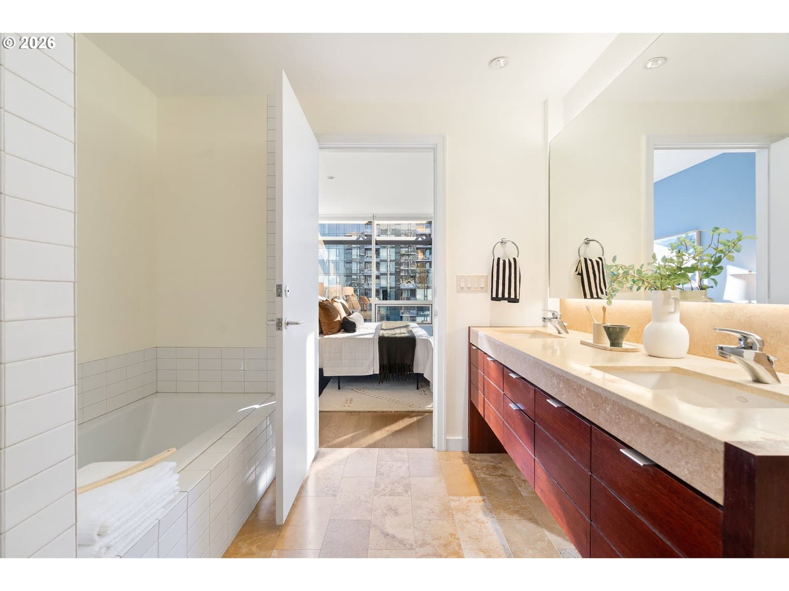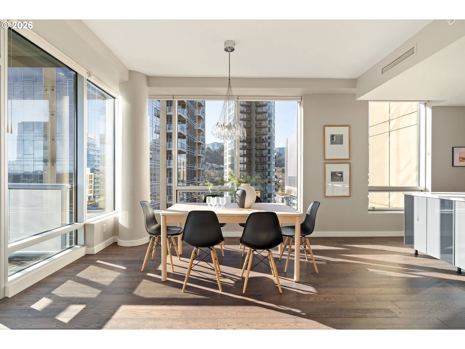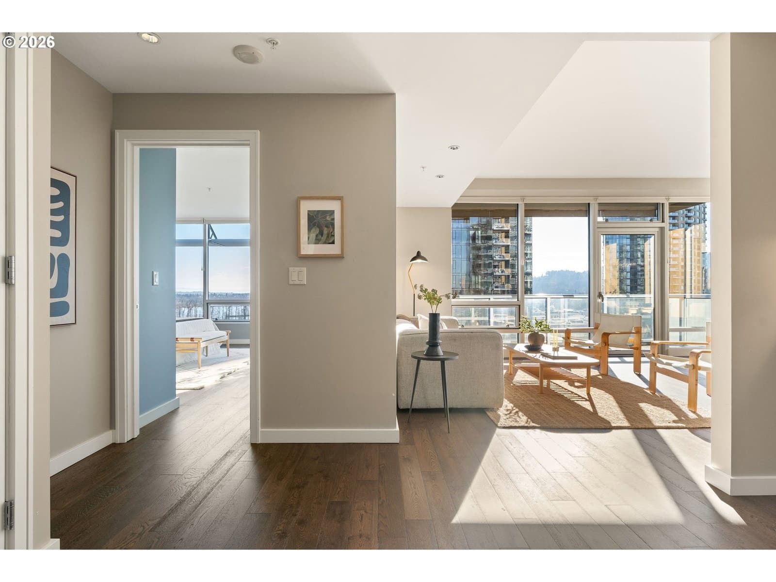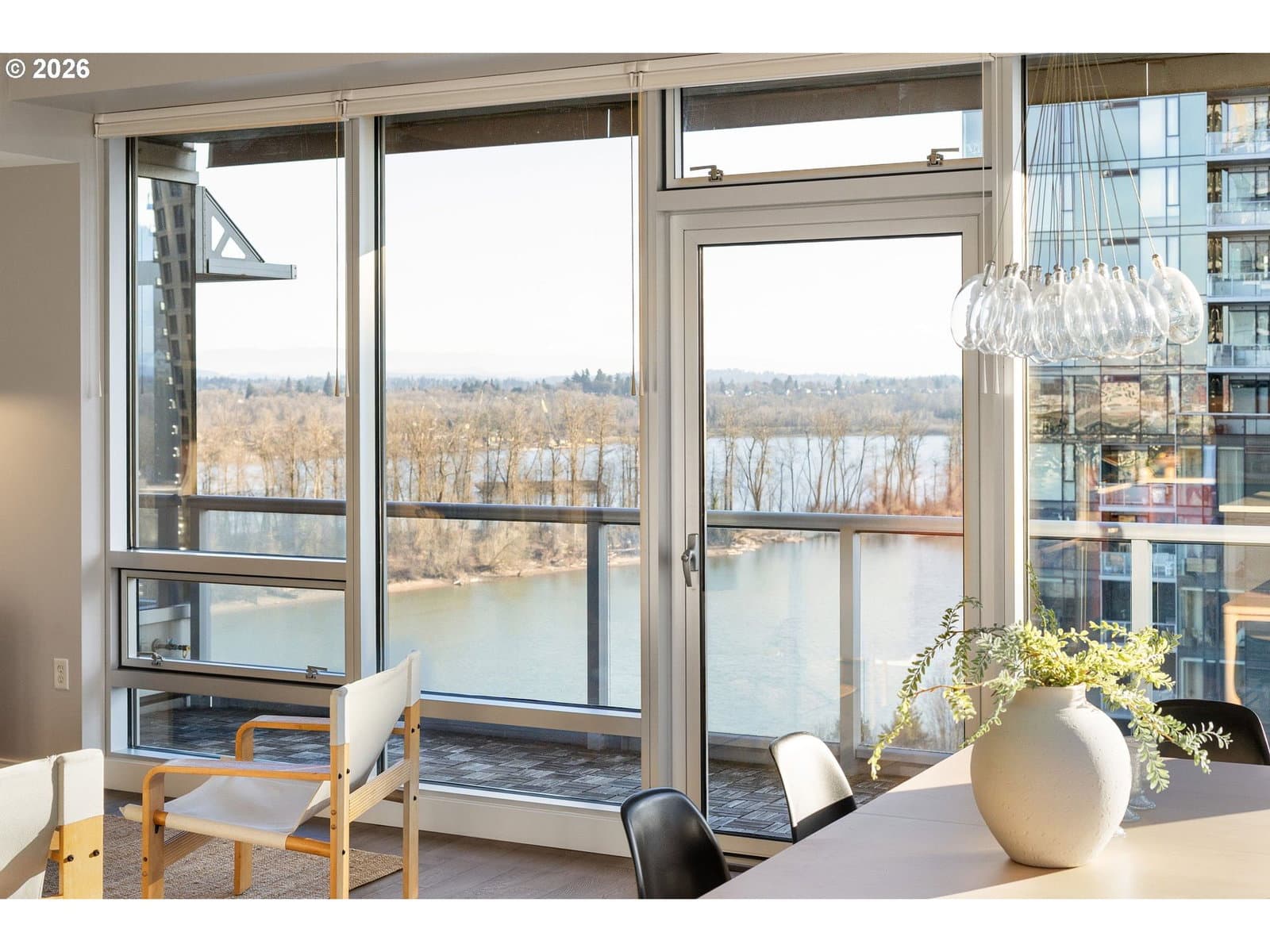 Beautifully updated one bedroom + den home with spectacular river and mountain views at the Meriwether in Portland’s coveted South Waterfront. One of the most sought after floor plans this sunny south facing corner home features protected views from every room, a 19 foot long balcony, walls of windows and a flexible den space. The flexible den has been thoughtfully upgraded with high end built-in storage, perfect for office or additional wardrobe. The upgrades continue with a gourmet kitchen island offering amazing additional storage, wood floors throughout, and new window coverings. The Meriwether is a luxury condominium building with 24/7 concierge, guest parking, a rentable guest suite, and kayak storage. Located in South Waterfront, an urban oasis along the river with amazing parks, OHSU, restaurants and more.