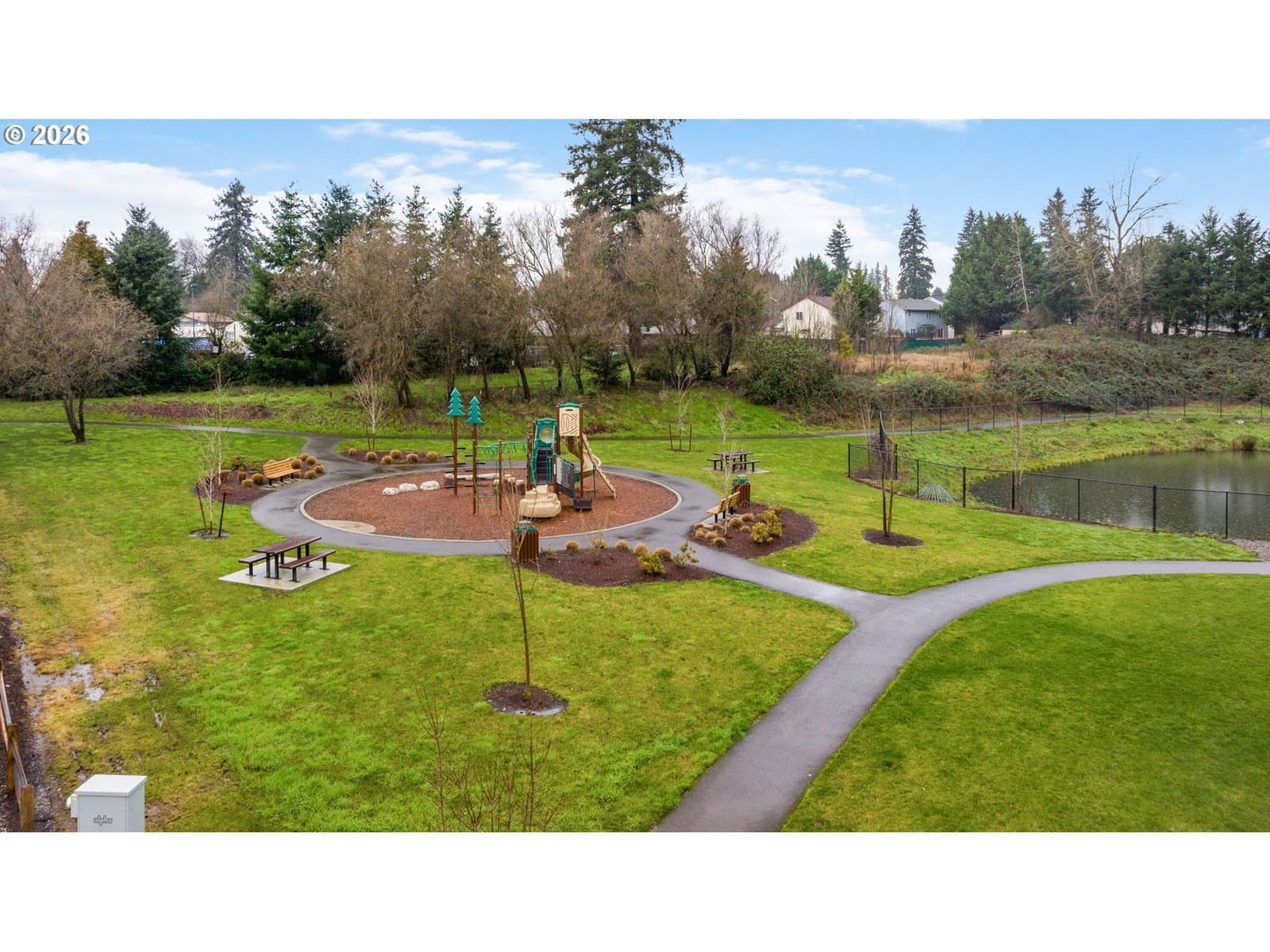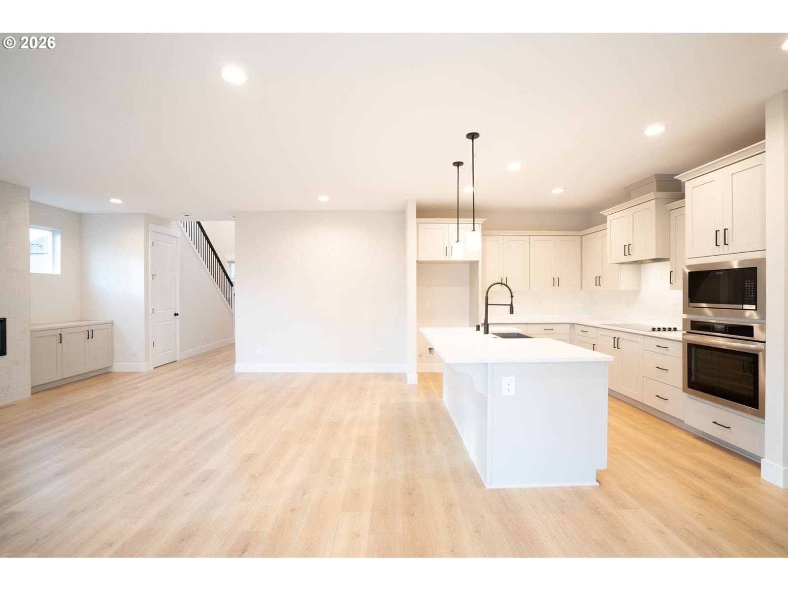 Exceptional corner-lot home offering 4 beds, 3 baths, and 2,390 SF, including a main-level bedroom and full bath—ideal for guests or multi-gen living. Chef’s kitchen features quartz countertops, apron sink, full-height picket tile backsplash, wall oven with separate cooktop, built-in microwave, generous counter space, and walk-in pantry. The great room highlights a fireplace wrapped in custom tile with beautiful built-ins. Upstairs includes a large loft, laundry room with cabinetry and utility sink, and a spacious primary suite with dual vanity, walk-in shower, and large walk-in closet. Over $50K in upgrades include water-resistant flooring on main level and baths, upgraded trim package with black hardware, wood-cased windows, wood shelving, insulated garage, architectural-grade lighting, front irrigation, and a covered patio.