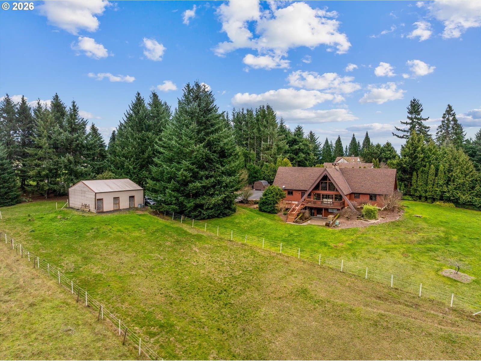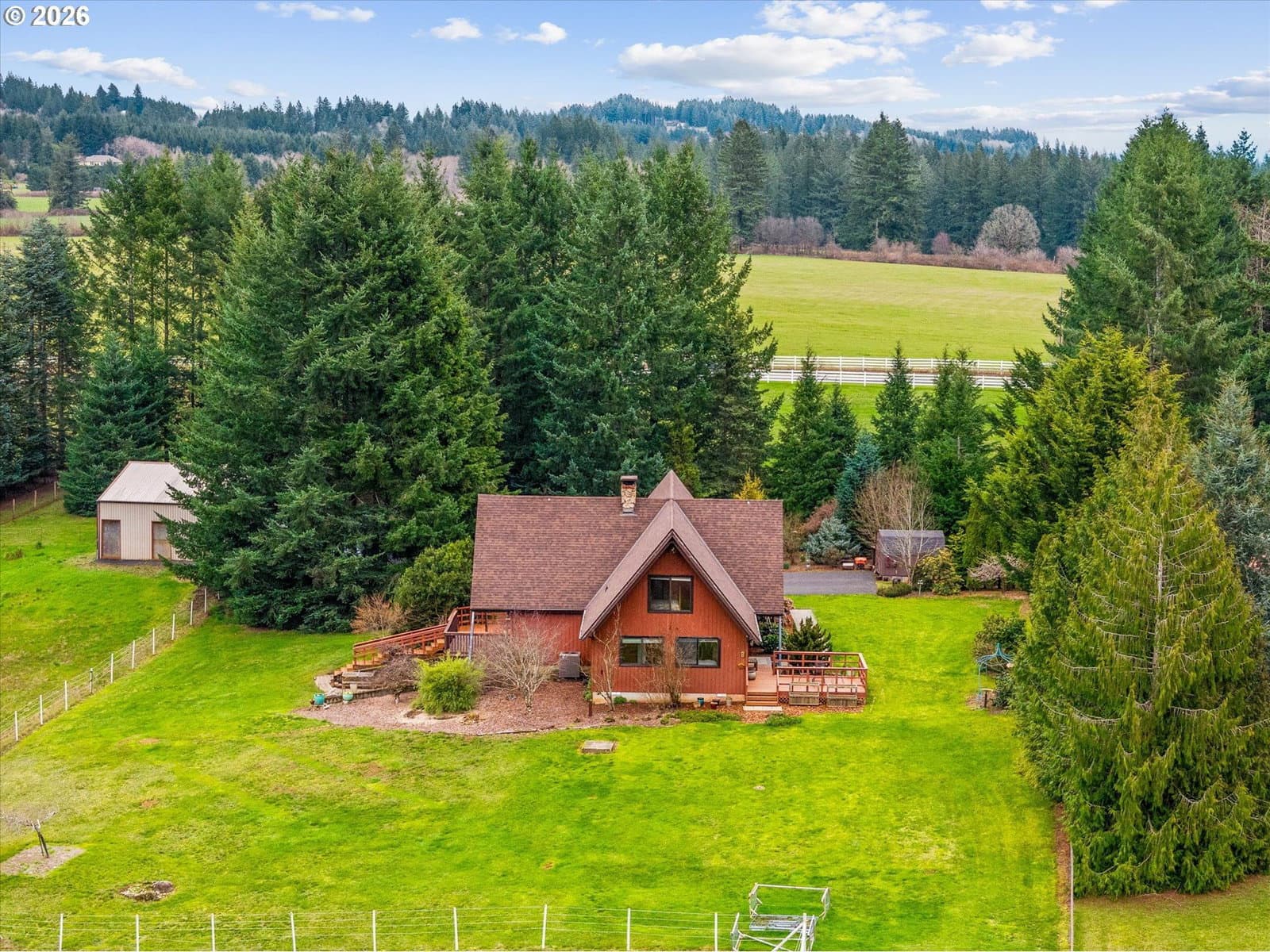 Tucked away at the end of a private drive and surrounded by six scenic acres, this striking A-frame home offers a rare opportunity to own something truly special. With breathtaking views and timeless architectural character, this is a home for those who appreciate craftsmanship and a setting that cannot be replicated. Inside, soaring vaulted ceilings, exposed beams, and walls of glass define the dramatic great room, where natural light pours in and the landscape becomes part of the living space. A stunning stone fireplace anchors the room, creating warmth and a natural gathering place. Rich wood finishes throughout the home reflect the classic Northwest lodge style, while the thoughtful layout offers three bedrooms, two baths, and an office designed for comfortable everyday living. The dining area captures beautiful views of the surrounding countryside, and the expansive deck invites you to relax, entertain, and take in the peaceful surroundings. Outside, the six private acres provide space, privacy, and endless possibilities—from gardening and recreation to simply enjoying the tranquility of nature. The landscaping is a nature enthusiast’s dream, with rare flowering trees, such as Japanese white wisteria, Japanese weeping snowbell and Sargent Tina dwarf crab apple tree. With the woodshop/barn, you will have a place for your hobbies or turn it back into the original home for 3 horses. This is not a typical home. It is a property for someone who values architecture, quality, and the kind of setting that makes every day feel like a retreat.