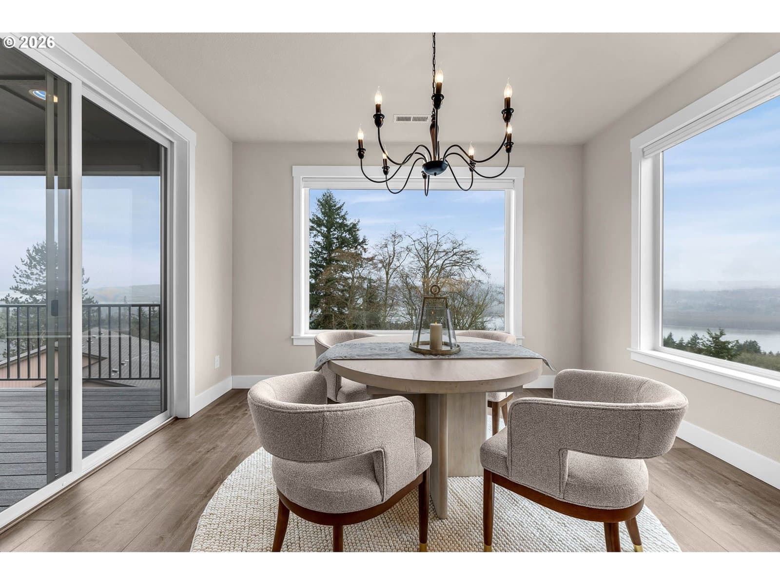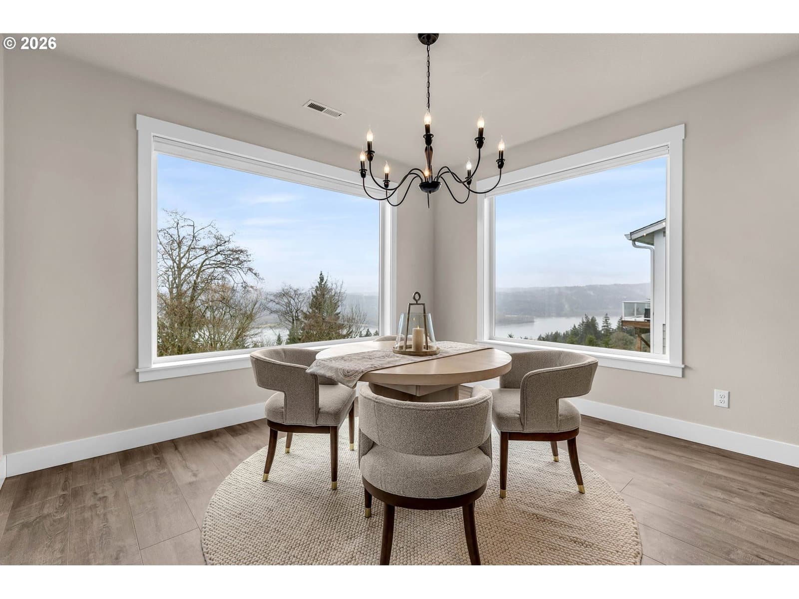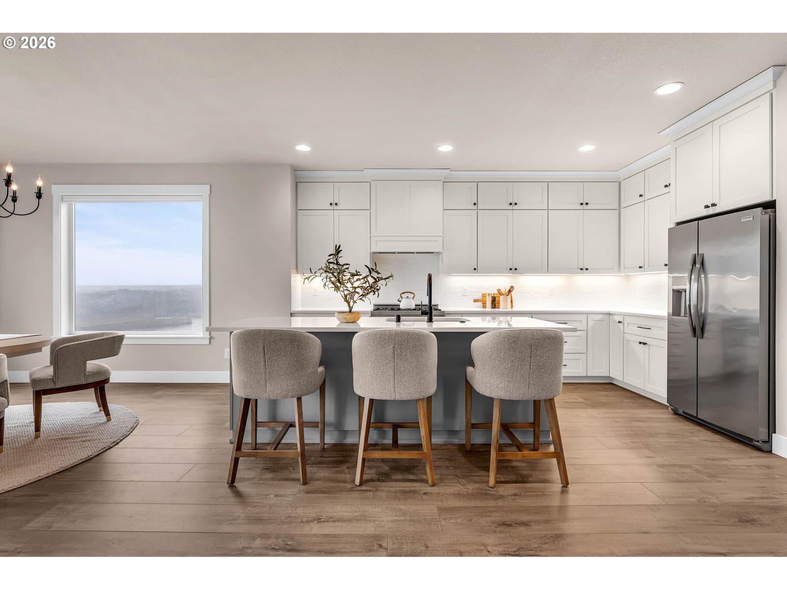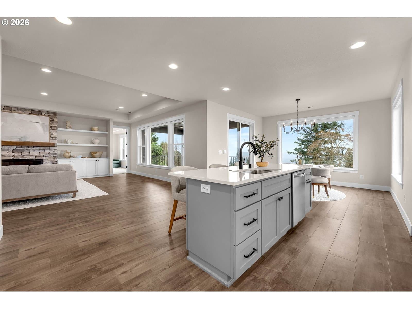 Perched within River Watch Estates, this exceptional single-level residence captures sweeping Columbia River views from the entire western side of the home. Expansive windows frame a constantly changing landscape where ships move quietly along the river, morning light reflects across the water, and evenings end with spectacular sunsets stretching across the horizon. The view is expansive, calming, and ever-changing — a daily reminder of why this vantage point is so special.The home was thoughtfully designed so the primary living spaces fully embrace the setting. The kitchen, dining, and living areas flow seamlessly together, creating an open and comfortable environment ideal for both everyday living and entertaining. A spacious kitchen with quartz surfaces, a gas range, and a walk-in pantry offers both style and functionality, while the living room’s cultured stone fireplace with built-in cabinetry and open shelving provides a warm and inviting focal point.Wide-plank flooring and a soft neutral palette carry throughout the home, allowing the natural light and the river views to take center stage. Electronic blinds provide privacy and shade when needed while still allowing the home to remain bright and connected to the landscape outside.The primary suite offers a relaxing retreat with a soaking tub, glass shower enclosure, and an oversized walk-in closet designed for comfort and convenience.Set on a generous corner lot, the property offers the presence of outdoor space while remaining beautifully low maintenance. The yard has been intentionally designed to minimize upkeep, allowing more time to enjoy the surroundings rather than spend weekends maintaining them. The covered composite deck with overhead heaters extends the living space outdoors, creating the perfect place to unwind while taking in the river, watching passing ships, or enjoying the dramatic western sunsets.Directly across the way, Horizon Park. Vacation where you live right here in Kalama.