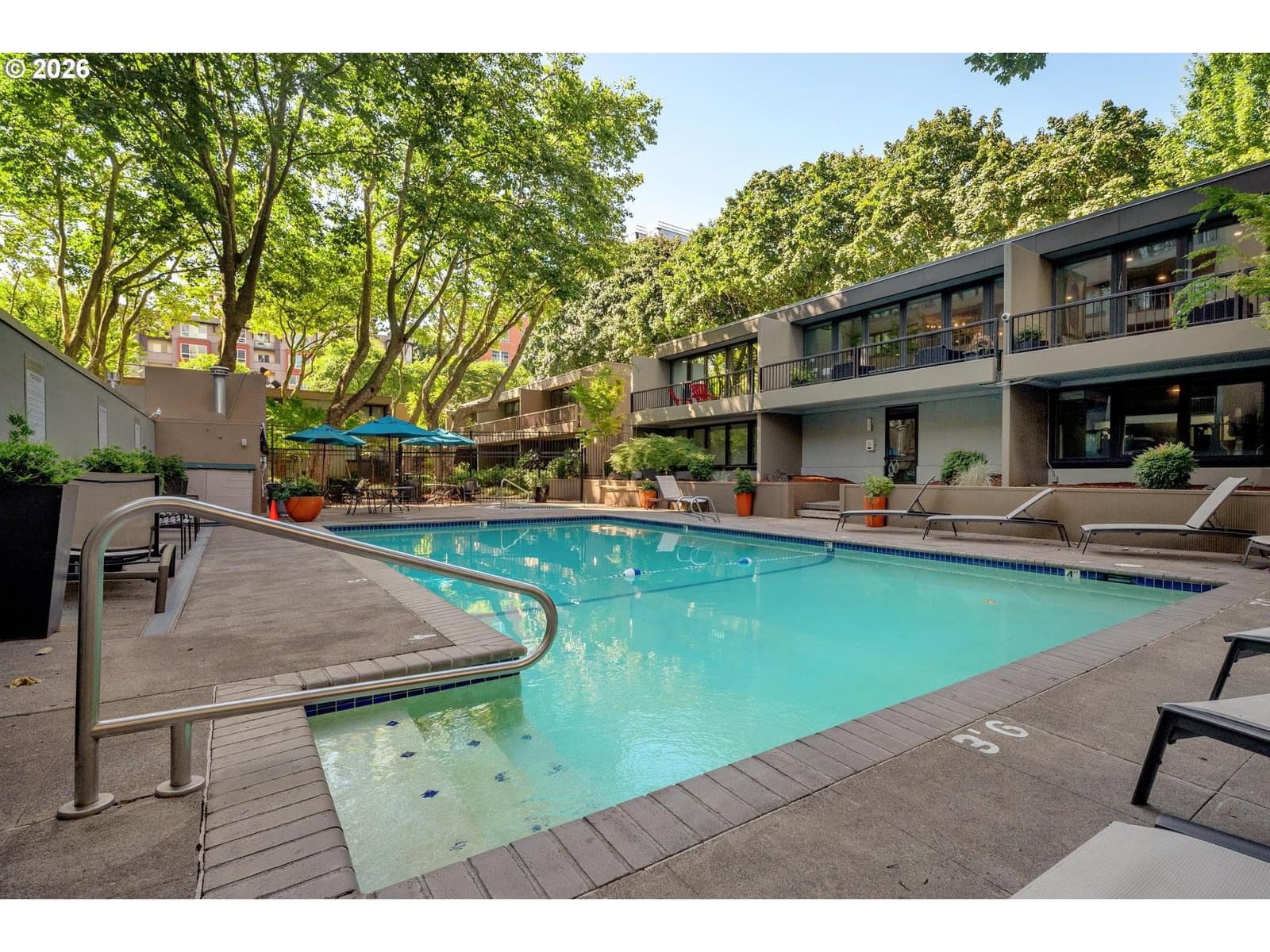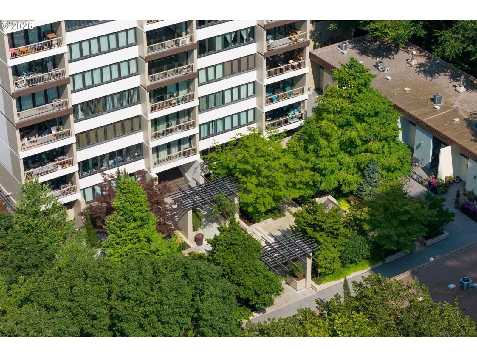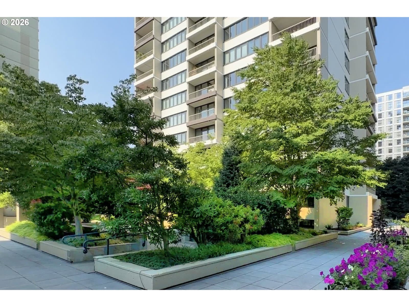 Urban living meets iconic design in this corner-unit home located in the historic Halprin Landscape District. Tree-lined paths and green spaces surround the landmark Skidmore, Owings & Merrill–designed SW Harrison West community, offering a timeless Portland lifestyle.Move-in ready, this 2-bedroom, 2-bath unit of the original owner, sits in the heart of downtown Portland with easy access to the waterfront, PSU, museums, theaters, parks, restaurants, shops, daily conveniences, TriMet and bus lines. Enjoy the quiet space overlooking the courtyard with peak-a-boo eastern views. Luxury vinyl plank throughout the floor plan. Recent updates from the main entrance to the front door of the unit, welcome you to your own city haven. The community offers an extensive list of HOA amenities: pool, spa, sauna (South Tower), gated courtyard, secure parking & storage, common areas, community room, BBQ area, high-speed internet, laundry facilities and evening security. HOA dues also include laundry, on-site management, grounds maintenance, water, sewer, garbage. Pets allowed with restrictions, rentals permitted with no rental cap or short-term rentals. Recent updates include exterior paint and deck resurfacing in 2021, with elevator improvements currently in progress. **Move-in fees and owner orientation required.