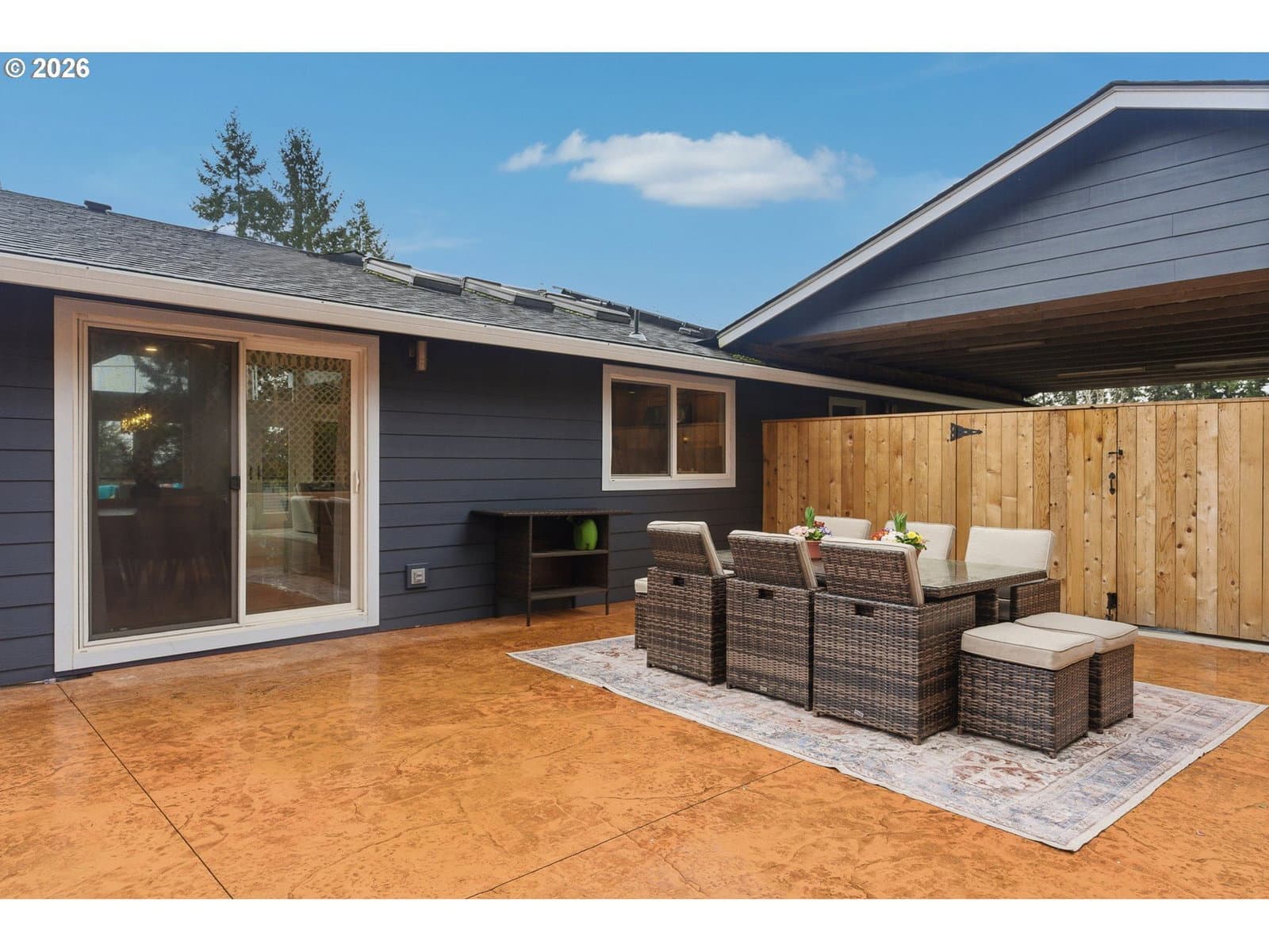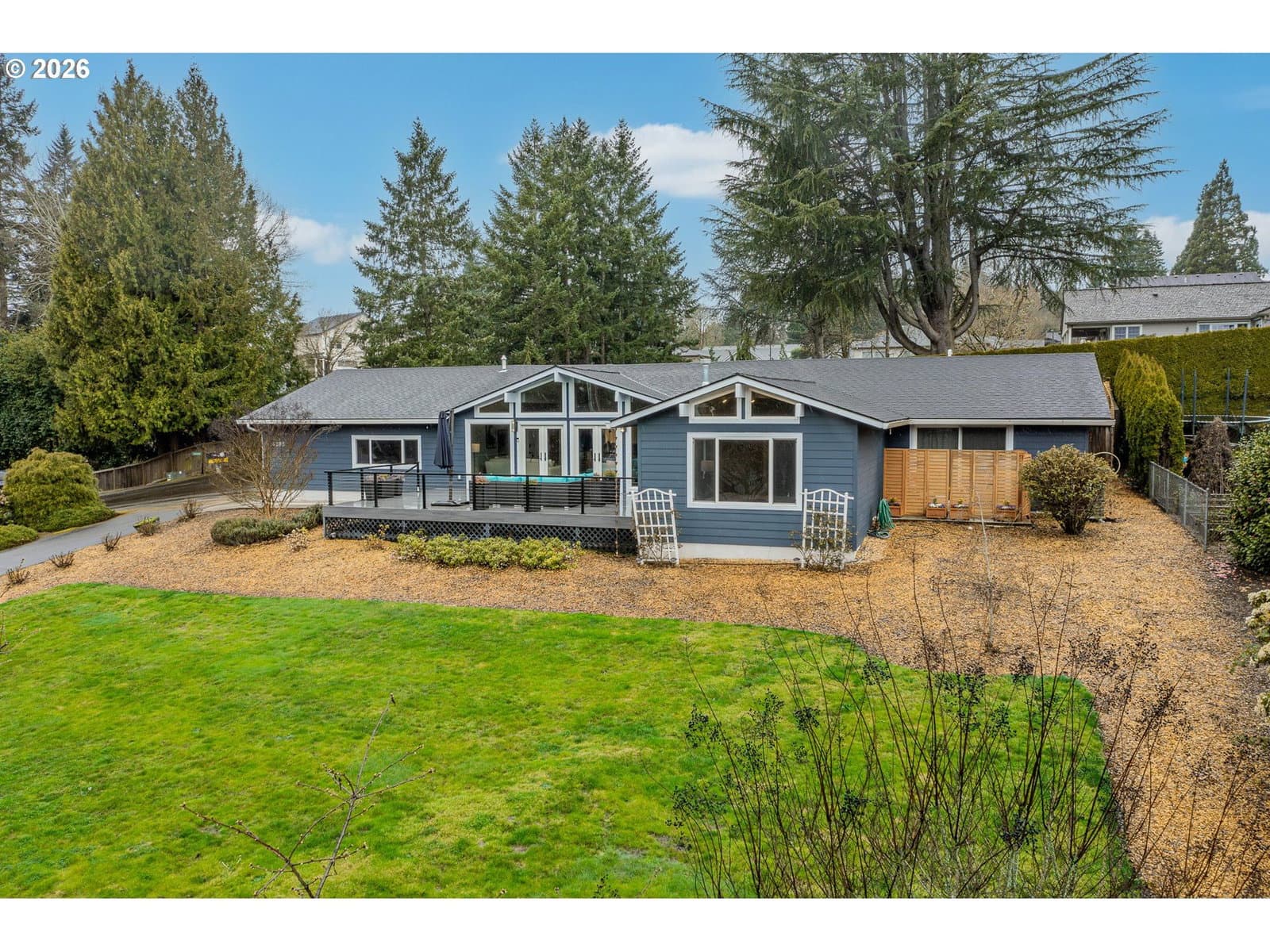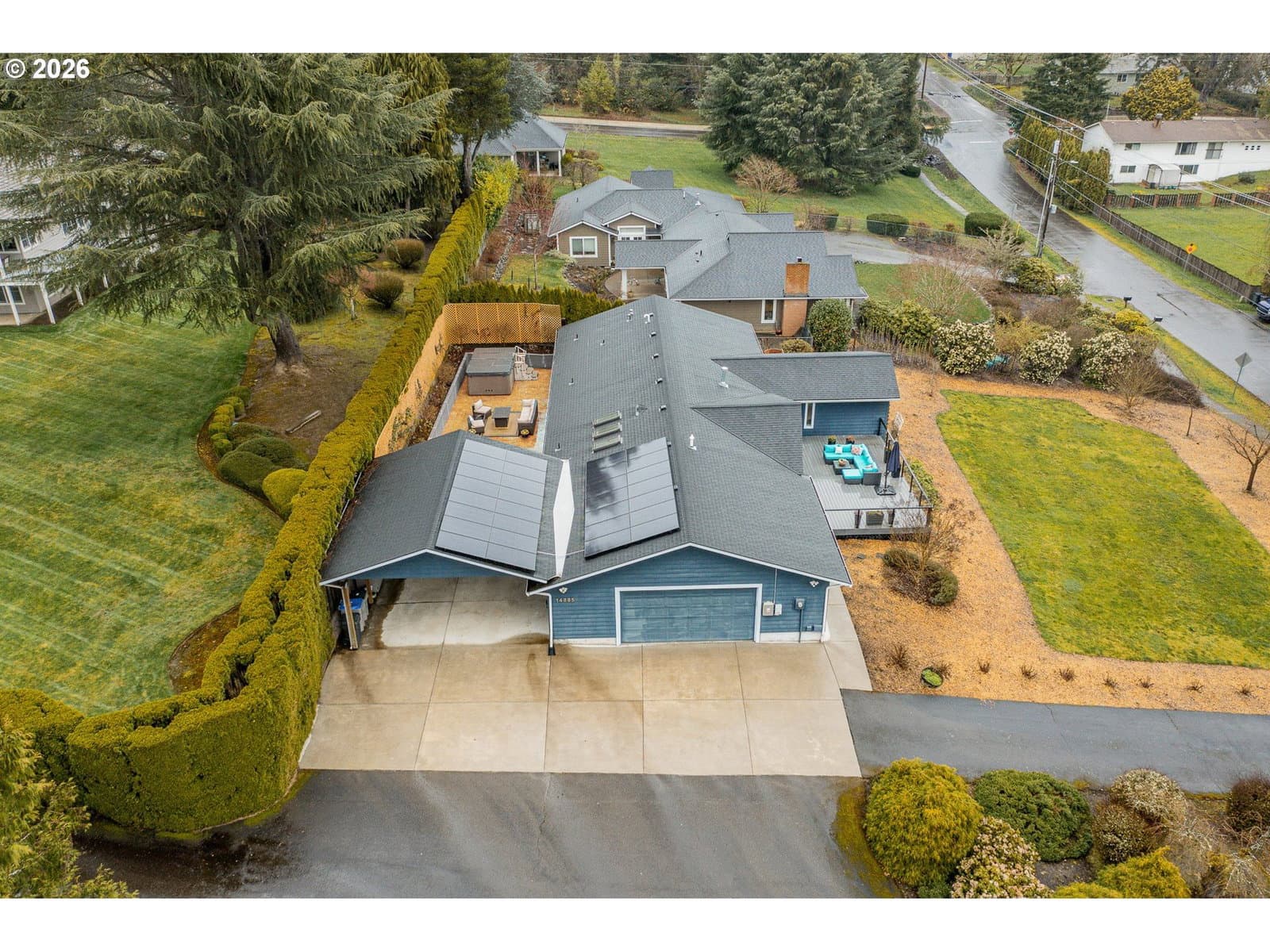 Remodeled Tigard home on large .38 acre lot. Three bedrooms, two bathrooms, plus an office all on one level. The home features a two-car garage plus an additional two-car covered carport, ample parking on the property, and a Tesla charging station. An owned 11.5 kW solar system supports energy-conscious living and affordable utilities. Thoughtfully updated and designed for both comfort and entertaining, this home blends modern efficiency with standout amenities. Recent upgrades include Hardi-plank siding and exterior paint, the roof was replaced in 2019, AC replaced in 2016, and an electric tankless water heater installed in 2022. Enjoy radiant floor heating with new boiler in 2025, complemented by updated windows, fresh interior paint, travertine flooring, and a well-appointed kitchen featuring granite countertops, stainless steel appliances, a new dishwasher, custom cabinetry, and generous storage. The kitchen flows seamlessly into the dining area, where custom built-in bar spaces include a sink, dishwasher, and wine cooler—ideal for hosting. The primary suite bathroom is a true retreat, complete with a built-in sauna, heated towel bar, and clawfoot soaking tub. Guests bath features a jetted tub with tile surround and towel warmer. Outdoor living is equally impressive. A large Trex deck overlooks the yard framed by cherry trees and Mt. Hood views, while the expansive, private backyard patio offers a swim spa and ample space for outdoor entertaining. Mature landscaping—including lilacs and roses along the retaining wall—creates a serene, garden-like setting perfect for gatherings or quiet evenings at home. Financing incentives available for rate buy down with preferred lender, call for information. Do not miss this well cared for home!