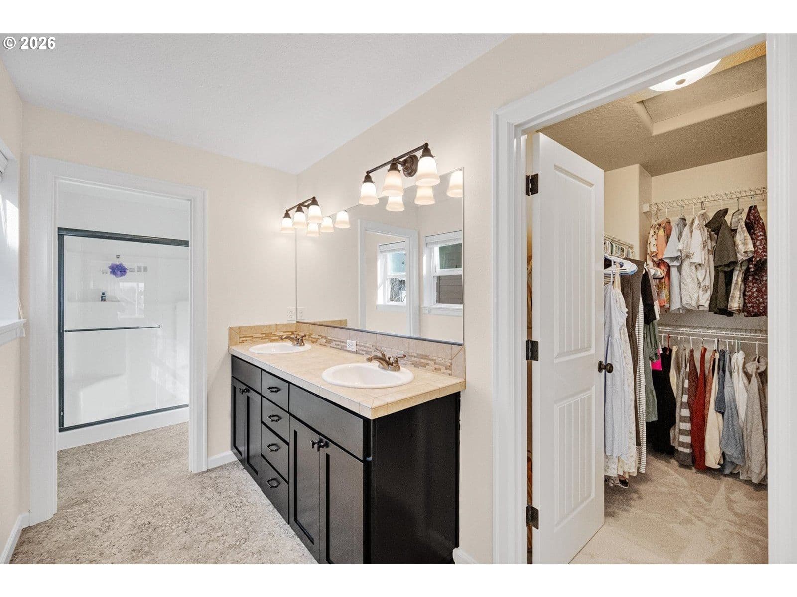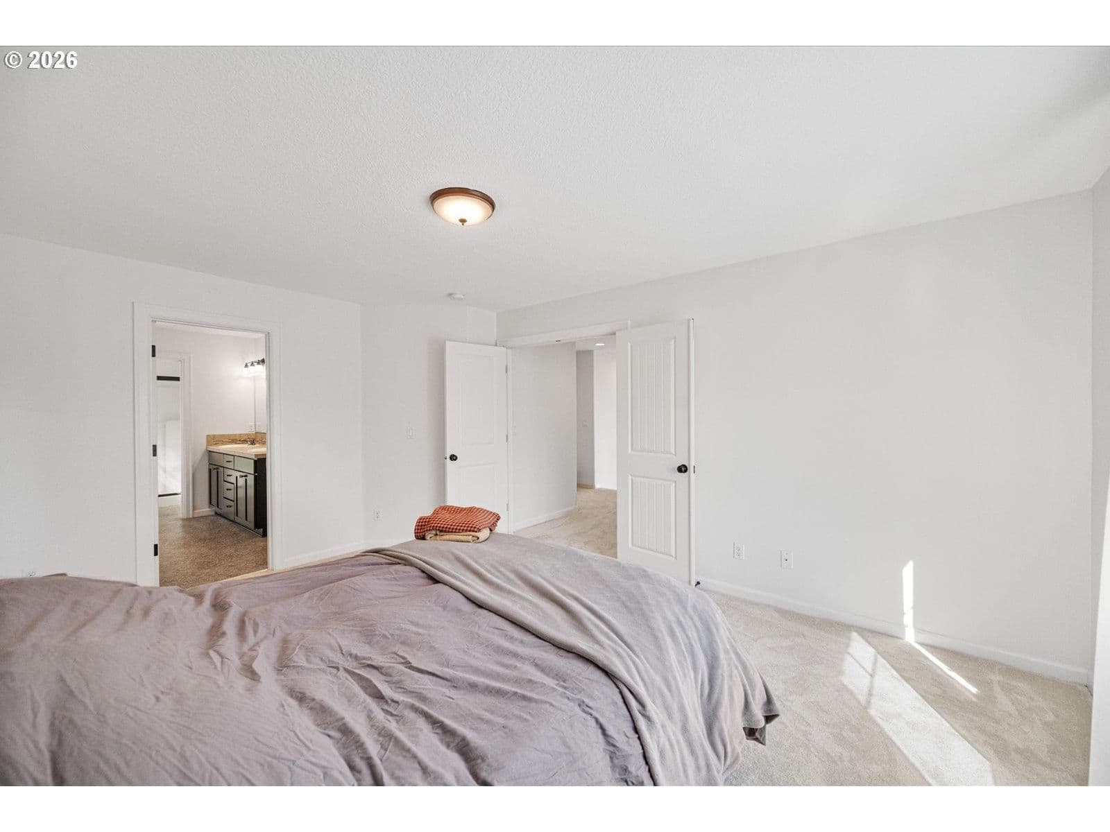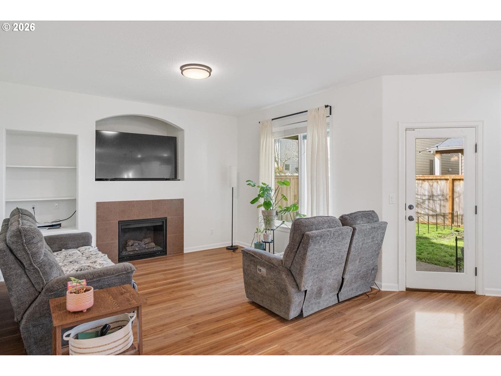 The interior of this Oregon City home features a bright, open-concept main floor designed for seamless living. A chef’s kitchen serves as the heart of the home, boasting quartz countertops, a gas range, subway tile backsplash, and a walk-in pantry. This space flows effortlessly into a spacious family room anchored by a gas fireplace with recessed shelving and expansive windows that pull in natural light. High-quality laminate flooring runs throughout the main level, connecting the dining area and living spaces for a clean, cohesive feel that is perfect for entertaining.