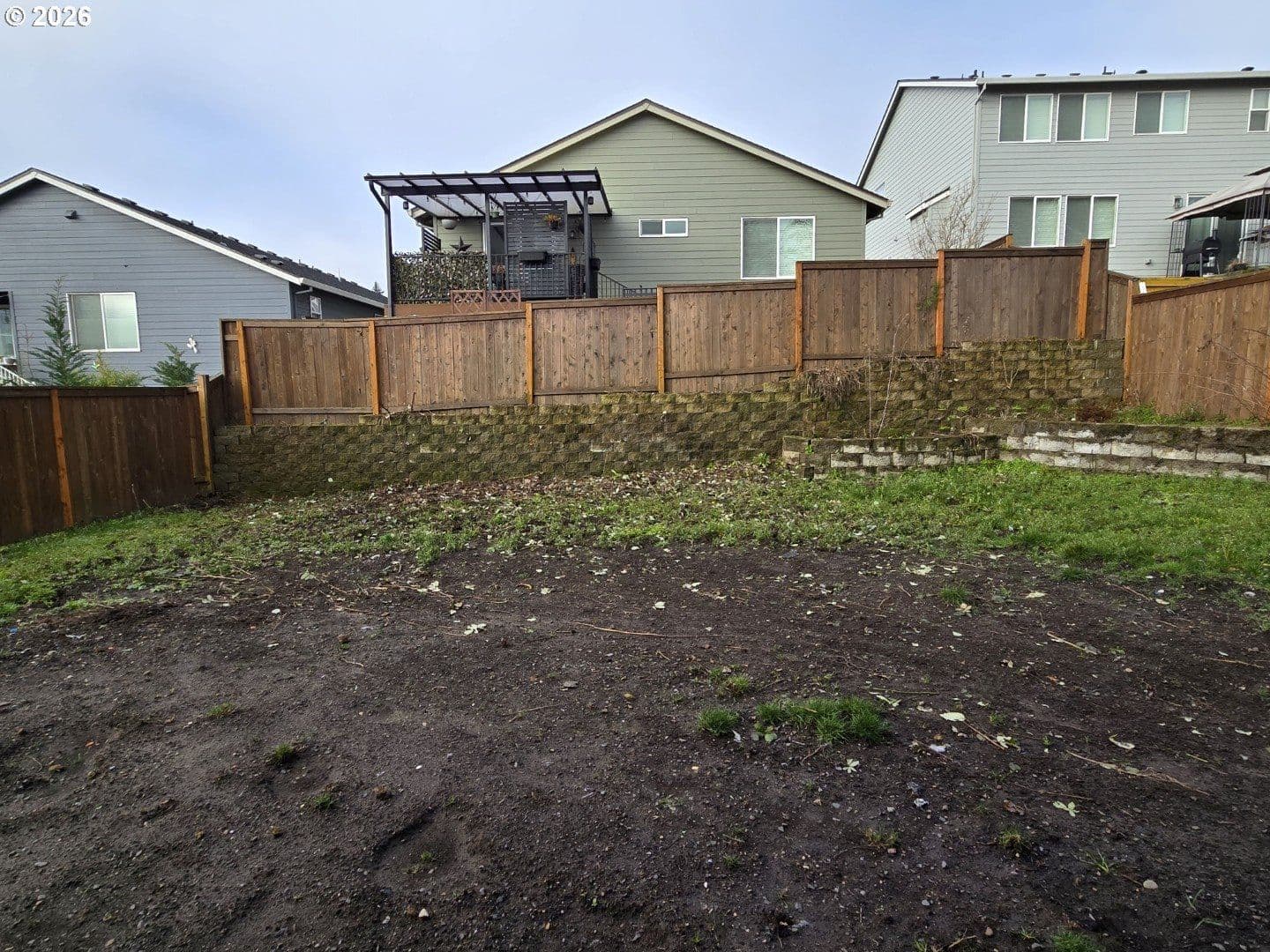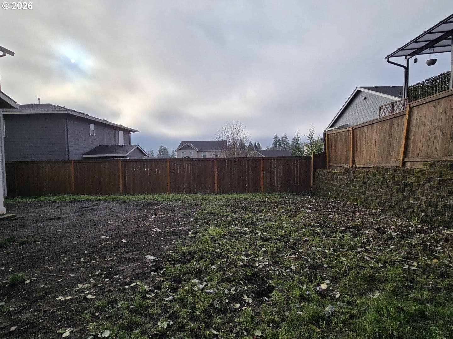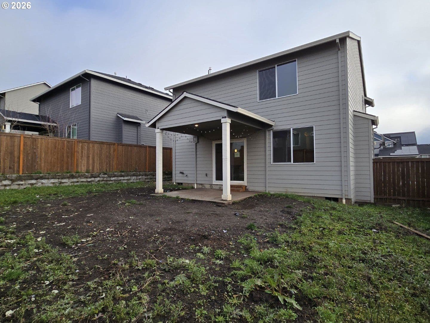 NO HOA. Spacious backyard with covered patio and retaining wall. Kitchen features granite countertops, pantry, high ceilings, gas range, stainless steel appliances, and ample storage. LVP flooring throughout the main level. Primary suite offers vaulted ceilings, walk-in closet, walk-in shower, and double-sink vanity. Both additional bedrooms include walk-in closets. Functional floor plan with generous storage throughout.